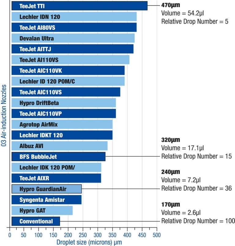 This is just a guide, because AI drop sizes can vary between 2.8 to 20 times that of a flat fan. The AHDB nozzle chart (below) shows actual measured size, volume and number of droplets produced by different AI nozzles.