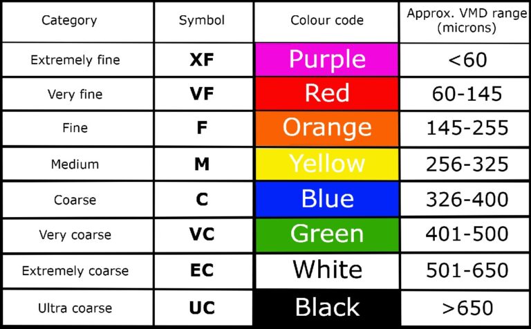 There is, however, a minimum and maximum VMD for each classification band. The differences in the number of drops, and their behaviour between the top and the bottom of the band, will influence the performance of the spray. This effect increases with the coarseness of the spectrum.